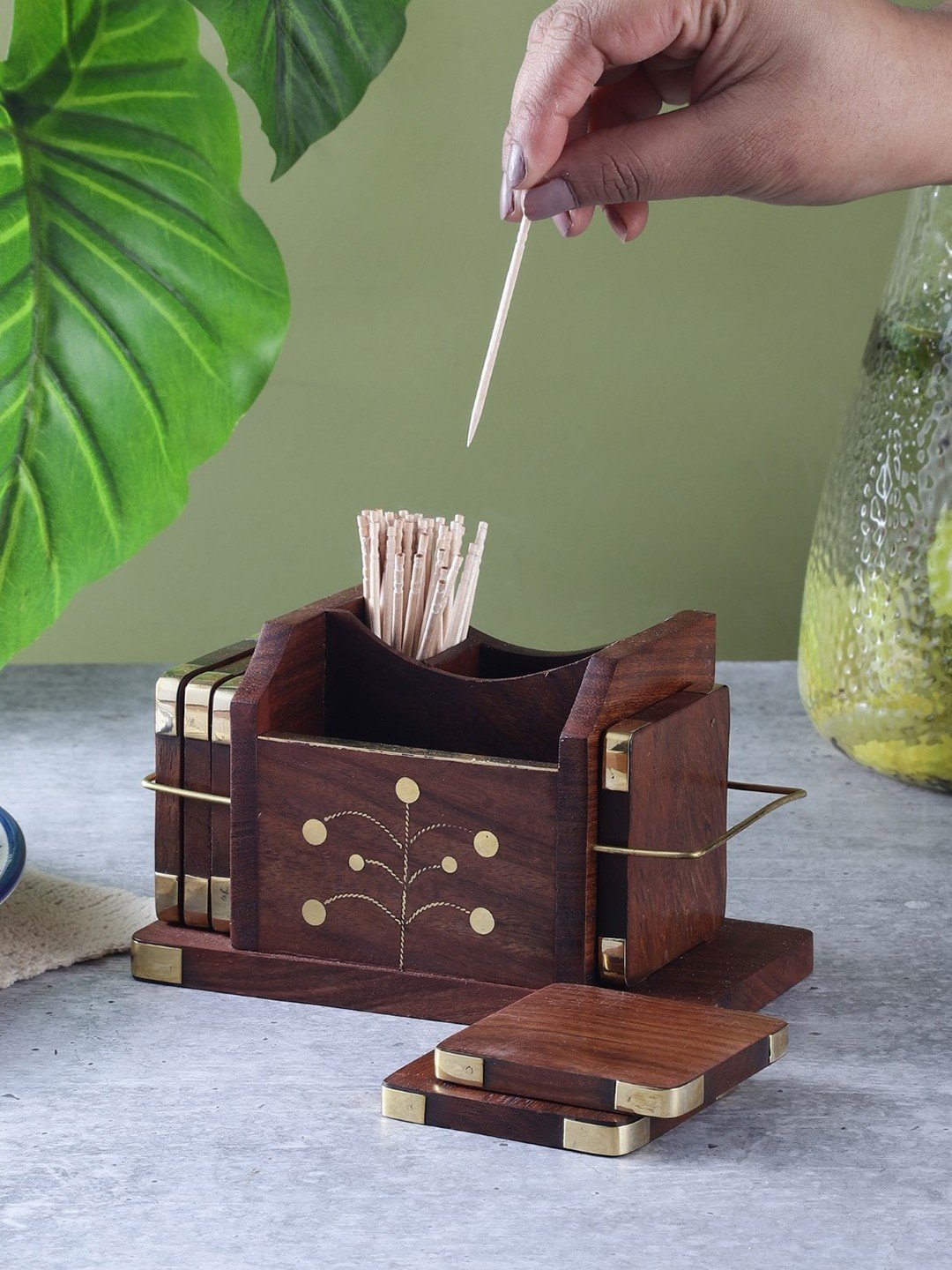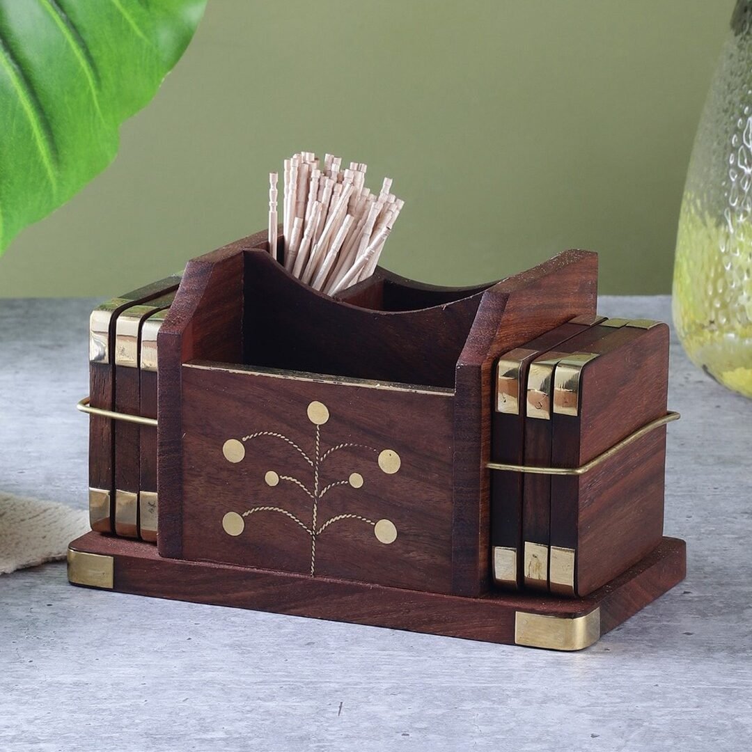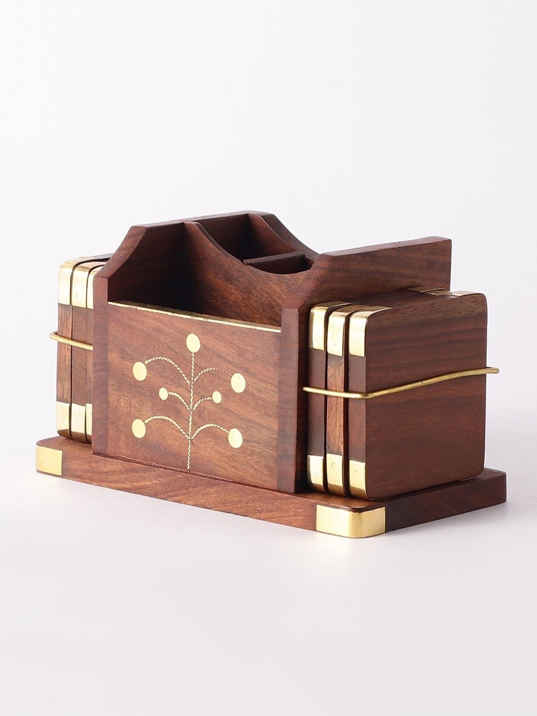 Wooden Cutlery Holder with 6 Pieces Floral Coaster