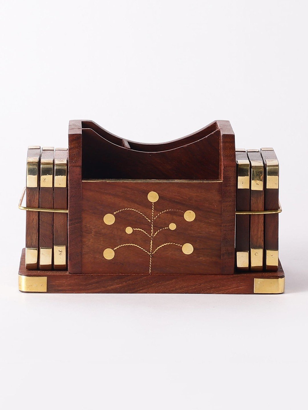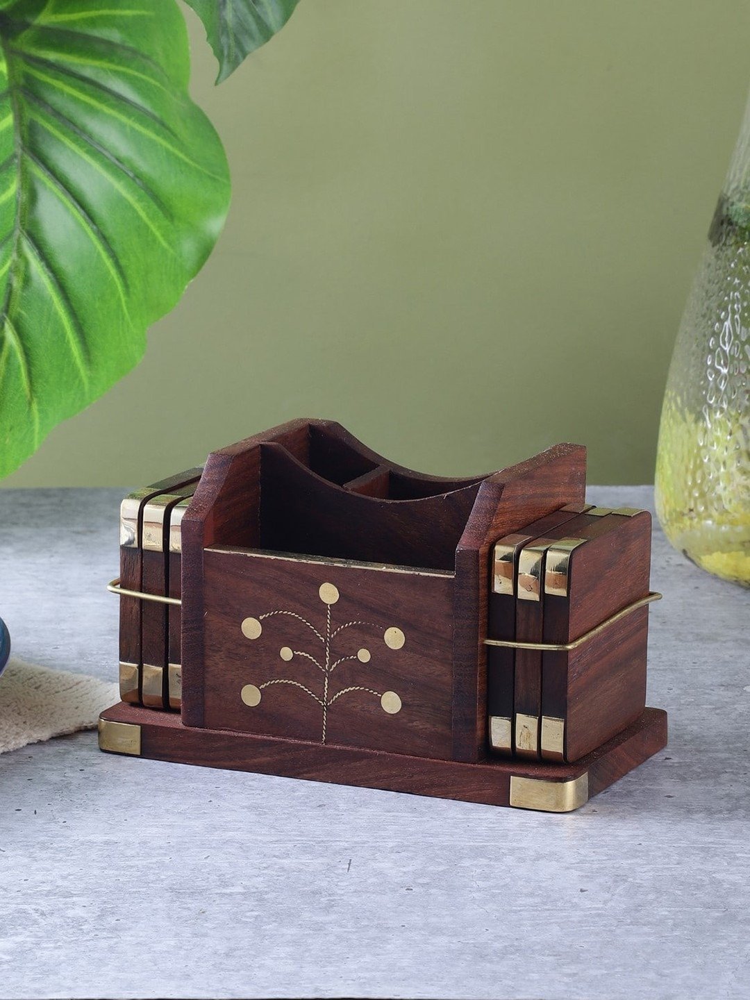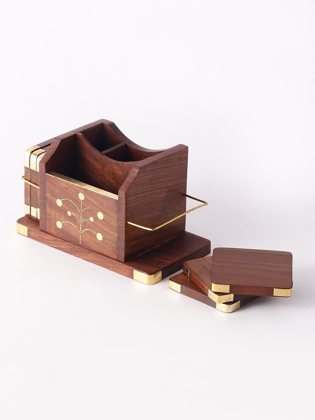 Wooden Cutlery Holder with 6 Pieces Floral Coaster